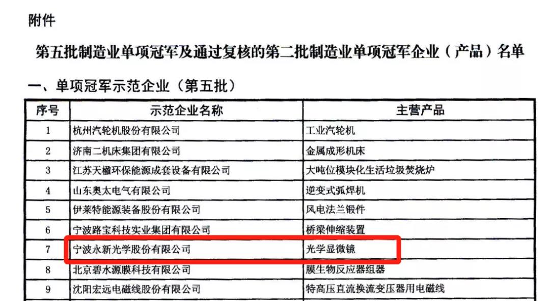 近日,工業(yè)和信息化部和中國工業(yè)經濟聯合會公布了第五批制造業(yè)單項冠軍及通過復核的第二批制造業(yè)單項冠軍企業(yè)(產品)名單(工信部聯政法函〔2020〕351號),寧波永新光學股份有限公司成功復評升級為第五批國家級制造業(yè)“單項冠軍示范企業(yè)”。