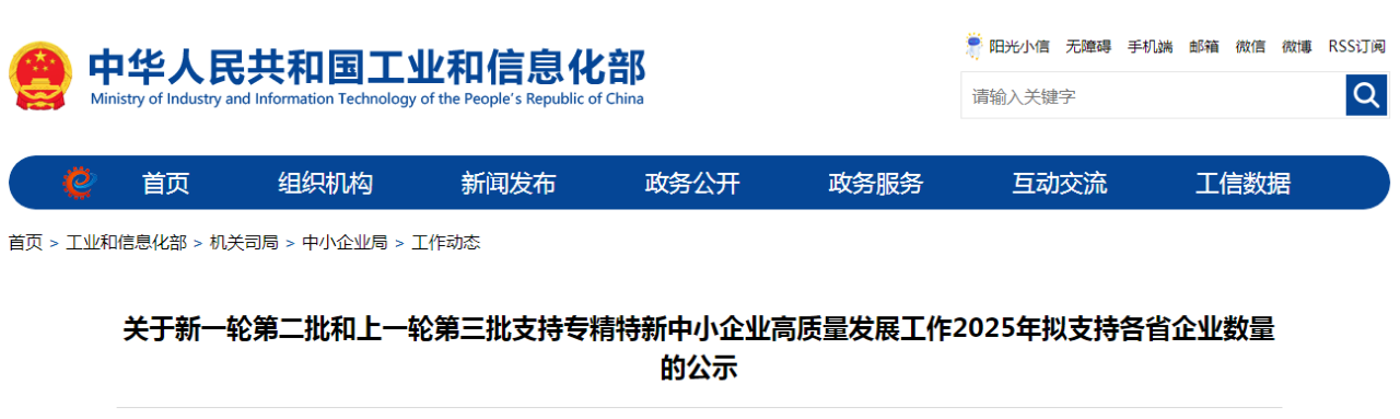 為深入貫徹習(xí)近平總書記關(guān)于促進中小企業(yè)專精特新發(fā)展的重要指示精神,按照《財政部 工業(yè)和信息化部關(guān)于進一步支持專精特新中小企業(yè)高質(zhì)量發(fā)展的通知》(財建〔2024〕148號)和《關(guān)于開展第三批第二年財政支持專精特新“小巨人”企業(yè)高質(zhì)量發(fā)展績效評價工作的函》(工企業(yè)函〔2025〕27號),現(xiàn)將新一輪第二批和上一輪第三批支持專精特新中小企業(yè)高質(zhì)量發(fā)展工作2025年擬支持各省企業(yè)數(shù)量向社會公示,公示時間為5月30日-6月6日。