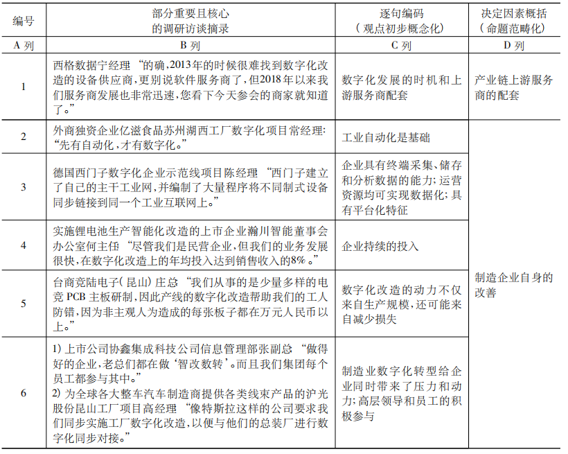 課題組運(yùn)用扎根研究方法,以蘇州制造業(yè)數(shù)字化改造專題調(diào)研的各個(gè)活動(dòng)為研究案例,設(shè)計(jì)了“制造業(yè)數(shù)字化改造決定因素”為主題的研究問題和命題,并運(yùn)用扎根理論中調(diào)研記錄、數(shù)據(jù)的收集和分析方法,將參觀、調(diào)研、研討、訪談、座談過程中凡是對(duì)制造業(yè)數(shù)字化改造產(chǎn)生影響的因素進(jìn)行了編碼匯總,依靠對(duì)記錄、數(shù)據(jù)進(jìn)行不斷地比較、聚類、歸納,實(shí)現(xiàn)從記錄、數(shù)據(jù)到被調(diào)研者的觀點(diǎn)初步概念化,到命題范疇化,到最終研究問題的達(dá)成。