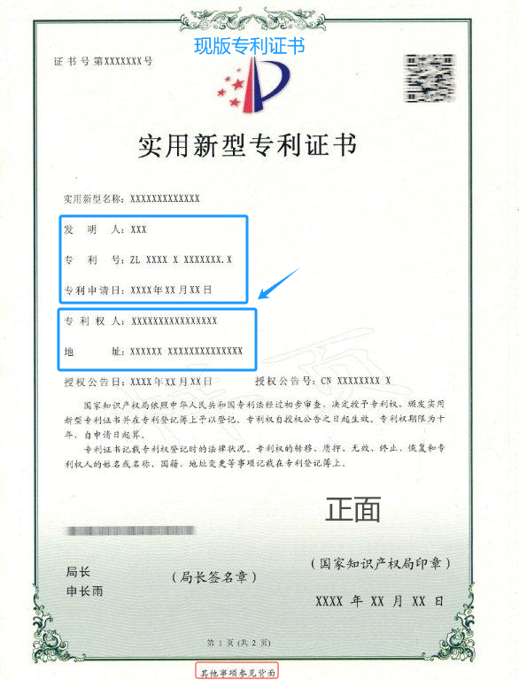 (新版實用新型專利證書和現(xiàn)版實用新型專利證書)