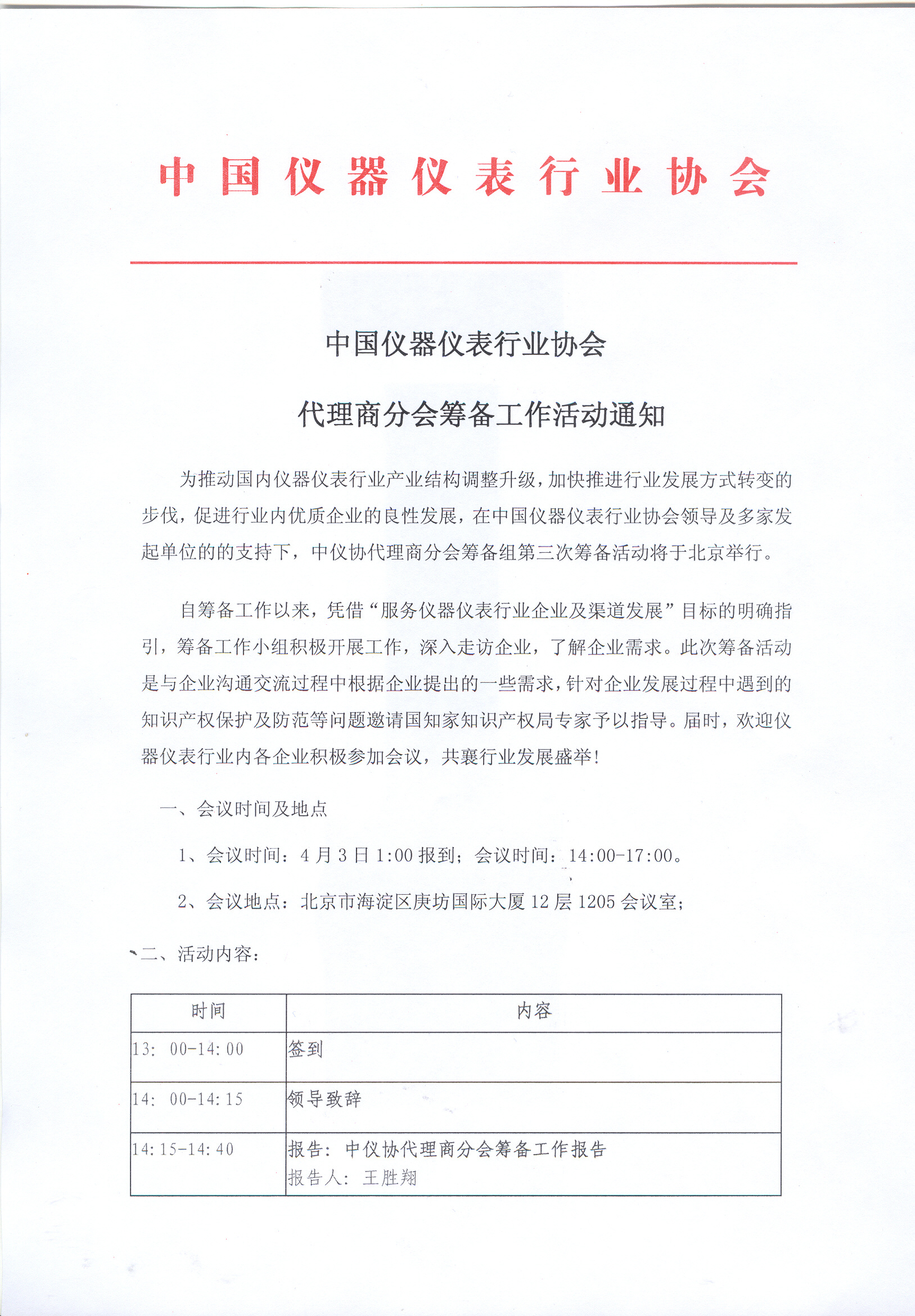 中國儀器儀表行業協會代理商分會籌備工作活動通知