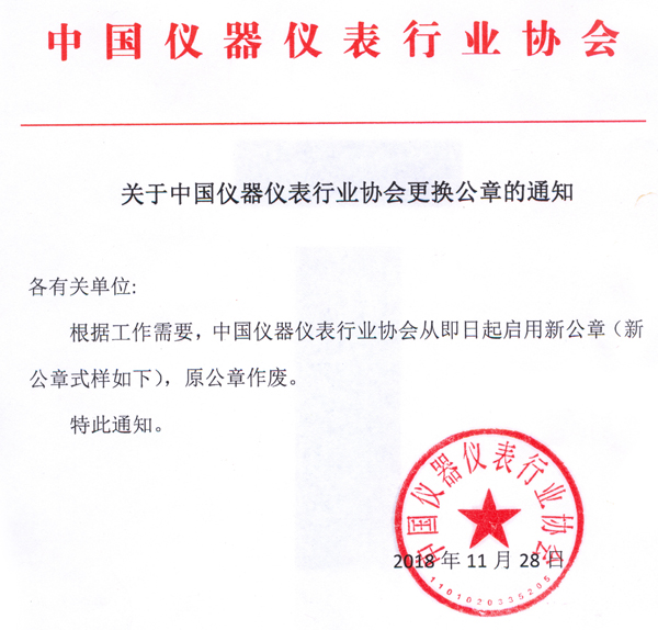 根據(jù)工作需要,中國儀器儀表行業(yè)協(xié)會從即日起啟用新公章(新公章式樣如下),原公章作廢。