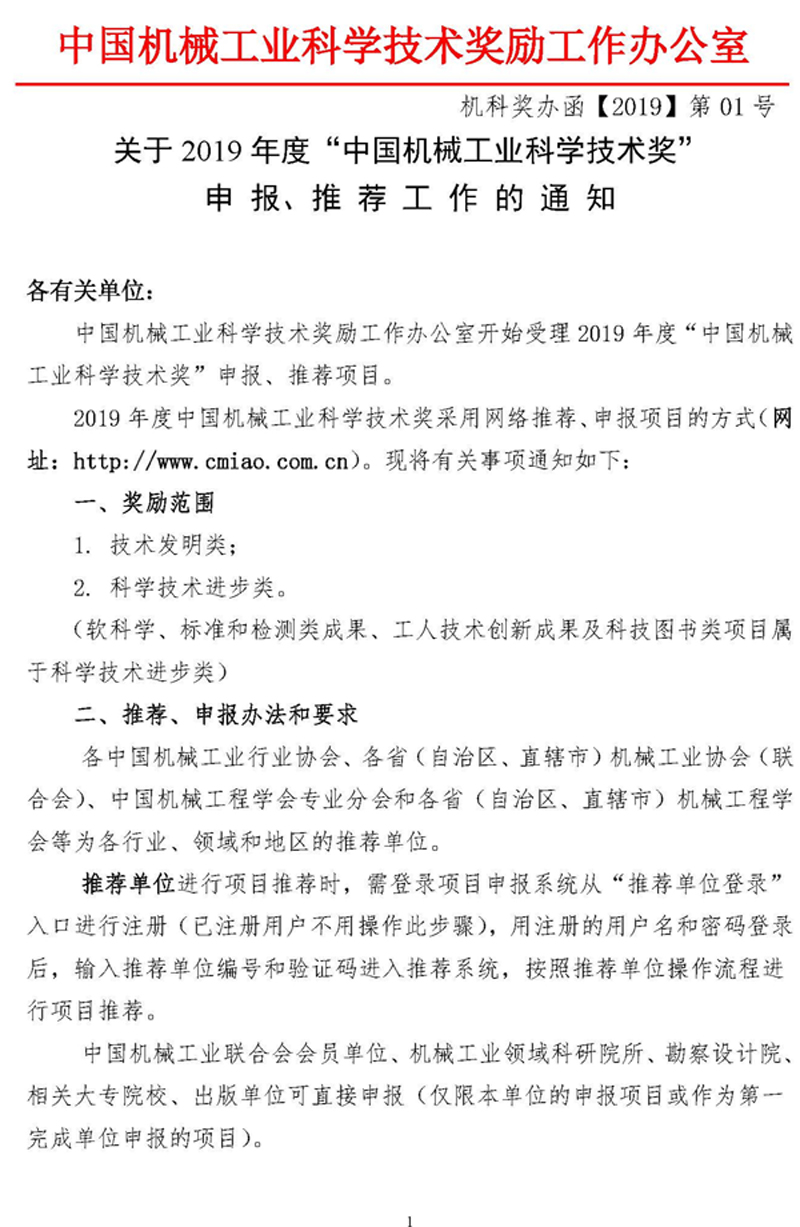 關于2019年度“中國機械工業科學技術獎”申報、推