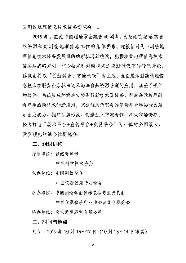 由中國測繪學(xué)會、中國儀器儀表行業(yè)協(xié)會主辦的第九屆中國測繪地理信息技術(shù)裝備博覽會定于2019 年10 月15 至17 日在江蘇省南京市舉行。博覽會將與中國測繪學(xué)會2019 年學(xué)術(shù)年會同期舉辦。