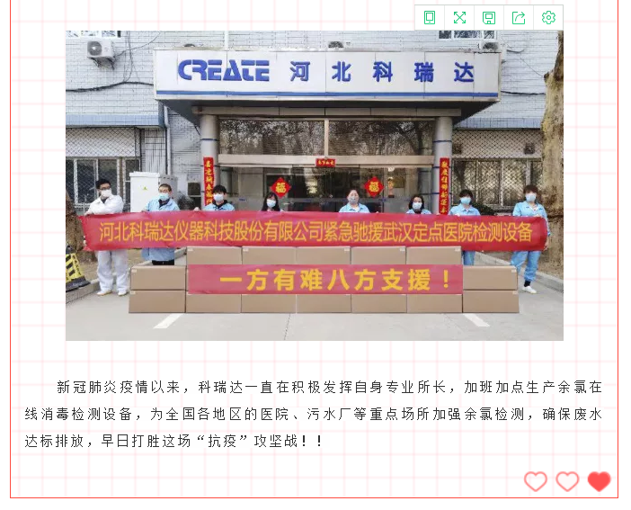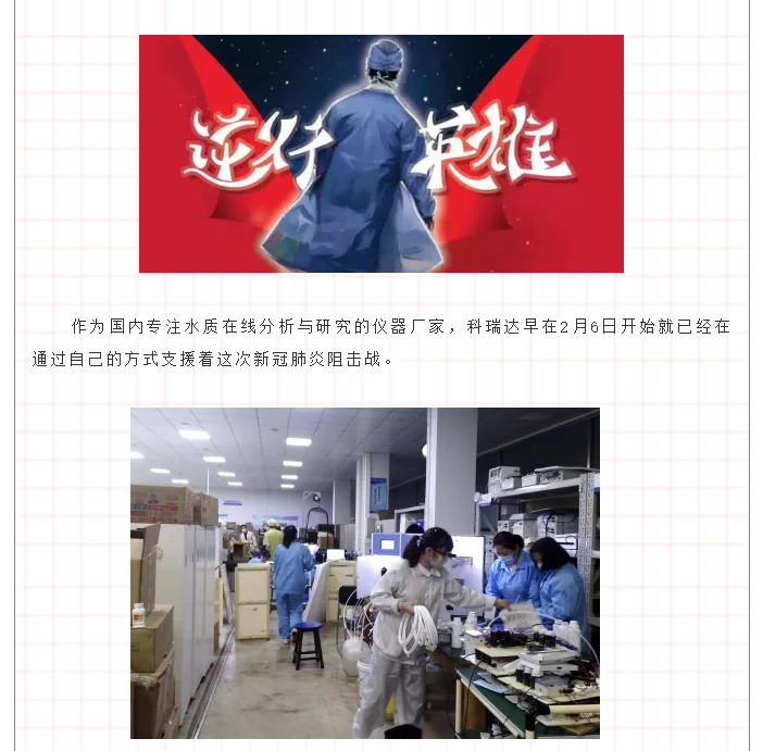 2月9日,第一時間與園區領導申請復工復產。加班加點,生產余氯在線分析儀,212日派物資專車馳援武漢,213日到達龔家嶺收費站,完成無接觸交貨;