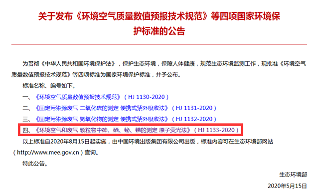 為貫徹《中華人民共和國環(huán)境保護(hù)法》和《中華人民共和國大氣污染防治法》,進(jìn)一步完善國家生態(tài)環(huán)境保護(hù)標(biāo)準(zhǔn)體系,近日,生態(tài)環(huán)境部發(fā)布四項國家生態(tài)環(huán)境保護(hù)標(biāo)準(zhǔn),其中《環(huán)境空氣和廢氣 顆粒物中砷、硒、 鉍、銻的測定 原子熒光法》(HJ 1133-2020),規(guī)范了環(huán)境空氣和廢氣顆粒物中砷、硒、鉍、銻的測定方法。該標(biāo)準(zhǔn)為首次發(fā)布,自2020年8月15日起實施。