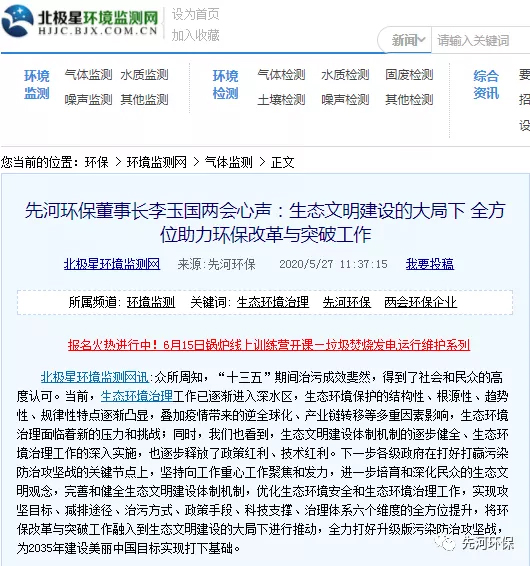 兩會期間,北極星環境監測網特邀先河環保(股票代碼:300137)董事長李玉國通過網絡媒體向“兩會”建言獻策。報道發出后,立即引發廣泛關注。