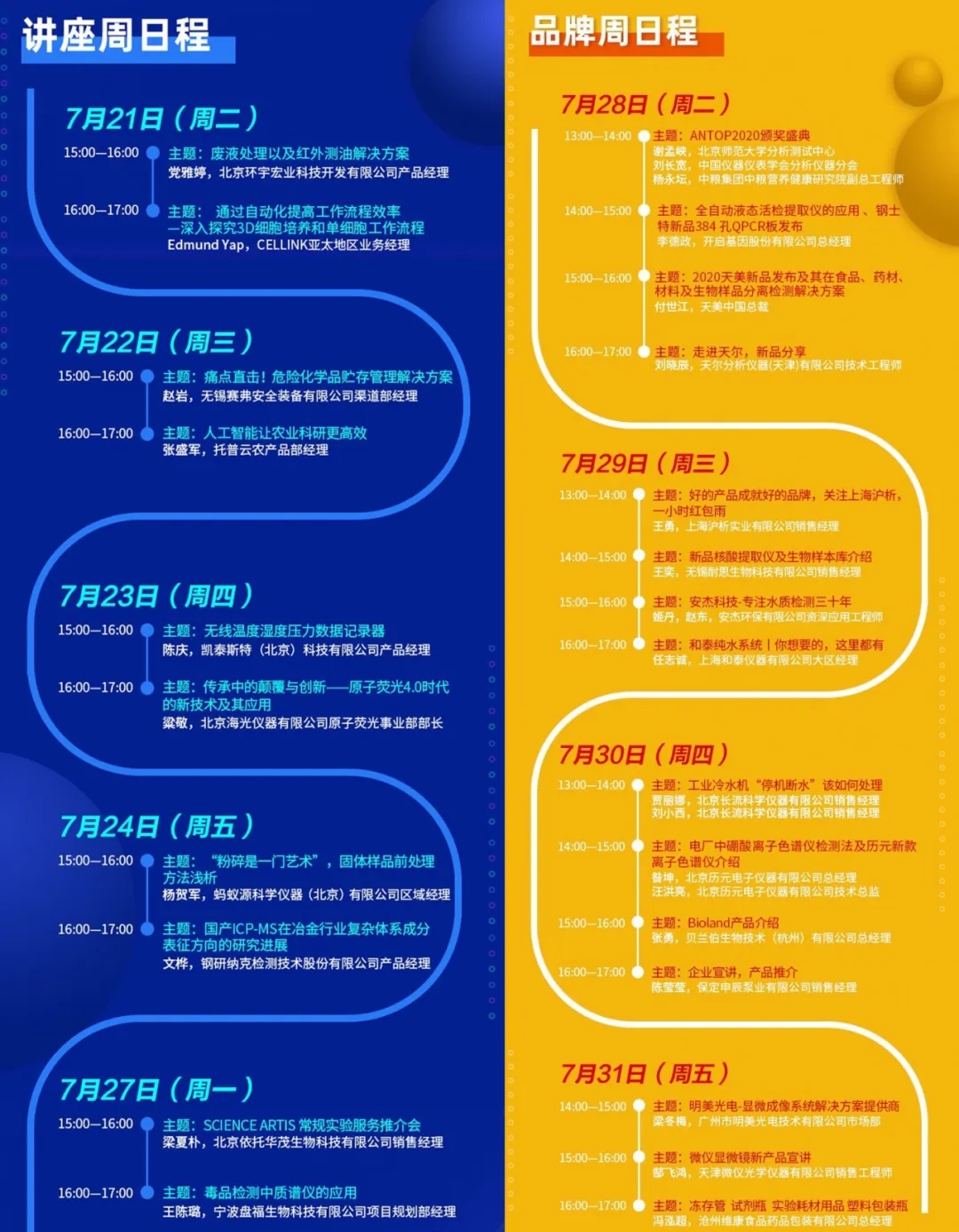 “線上直播”部分,721-31日將有26場次的線上直播,包含了“講座周”、“品牌周”兩大板塊。“講座周”以傳播普及先進技術和經驗為主要內容,“品牌周”以產品推介為主要內容。歡迎科學儀器行業(yè)從業(yè)者于720-31日期間,參觀“CISILE線上展覽”,觀看線上直播。