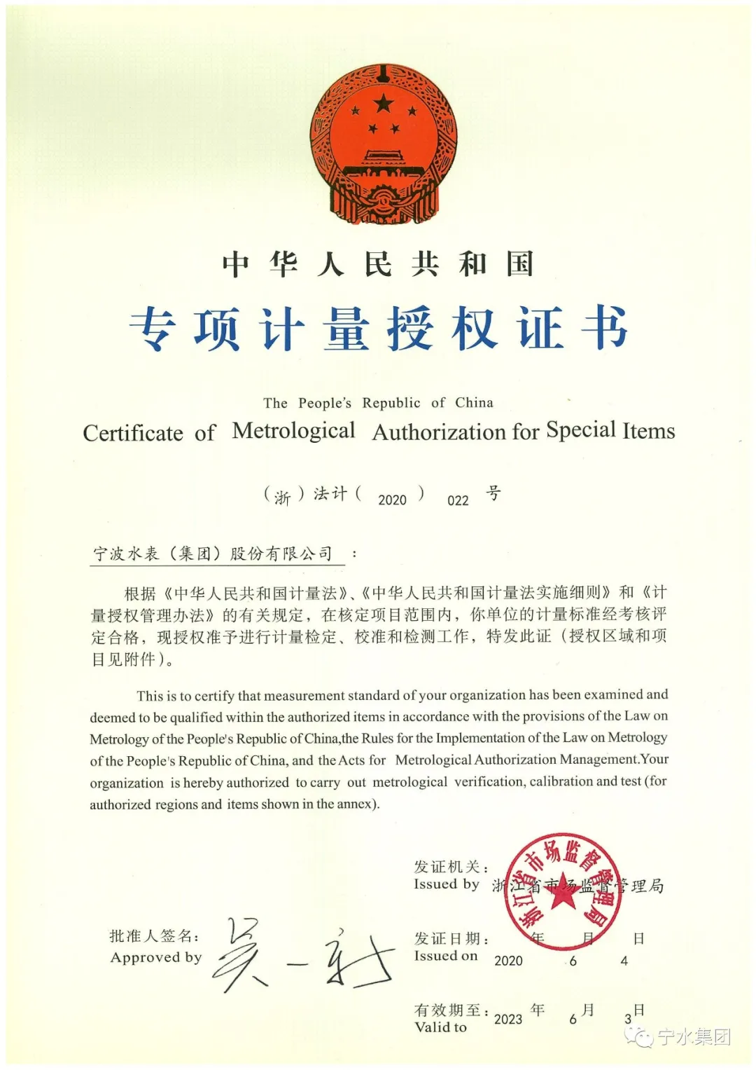 公司順利獲得浙江省市場監督管理局頒發的《專項計量授權證書》,成為全國首家民用水表強制檢定“二檢合一”改革試點企業。