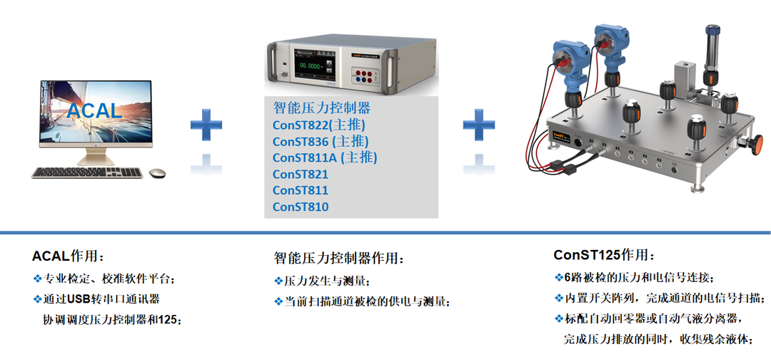 通過該設備,可配合ConST800系列壓力控制器、ACal檢定/校準系統軟件,構成一套多通道全自動壓力檢定/校準系統,檢校過程多通道自動切換,自動采集數據,完成后自動出具證書,滿足用戶的大批量測試需求。