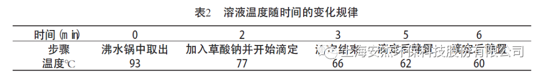 從沸水浴中取出錐形瓶時(shí)的溫度可達(dá)93℃,但加入草酸鈉溫度下降了16℃;滴定過(guò)程只用了1min, 溫度卻又下降了11℃,達(dá)到66℃。與反應(yīng)溫度下限只差6℃;滴定結(jié)束后在放置3min,溫度降至60℃。由此可見(jiàn),滴定過(guò)程必須自加熱結(jié)束起快速進(jìn)行,爭(zhēng)取在3min 內(nèi)結(jié)束滴定,不能超過(guò)6 min。