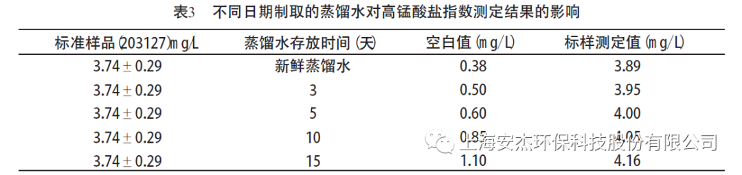 標(biāo)樣測(cè)定值隨著空白值的增大而增大,當(dāng)空白值為0.60 mg/ L (即蒸餾水存放時(shí)間為5 天)時(shí),測(cè)定結(jié)果已接近不確定度的上限,而空白值超過(guò)0.85 mg/ L (即蒸餾水存放時(shí)間超過(guò)10 天)時(shí),測(cè)定結(jié)果已超出不確定度的上限。因此,在測(cè)定高錳酸鹽指數(shù)時(shí),不要使用存放時(shí)間超過(guò)5 天的蒸餾水,最好取用新鮮蒸餾水,這樣就可以減少空白值對(duì)測(cè)定結(jié)果的影響。
