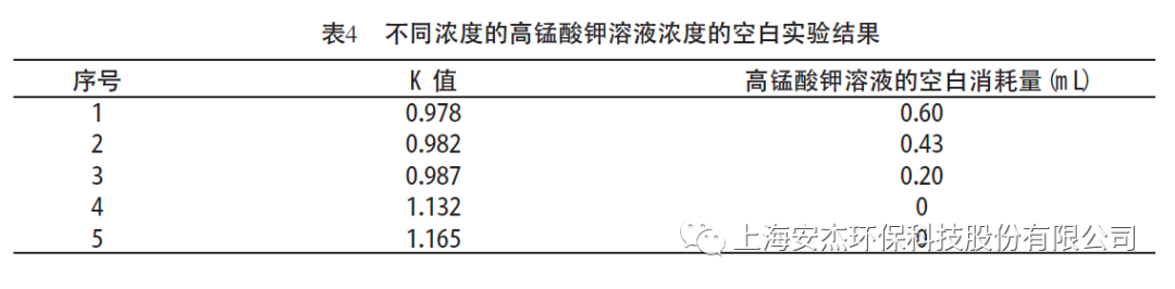 當(dāng)K值較小即高錳酸鉀溶液濃度過(guò)低時(shí),空白消耗量偏大,使測(cè)定結(jié)果偏低;當(dāng)K 值較大即高錳酸鉀溶液濃度大于0.0100 mol/L時(shí),空白消耗量為0 mL,空白實(shí)驗(yàn)無(wú)法完成。所以在測(cè)定樣品前首先要將高錳酸鉀溶液濃度調(diào)至≤0.0100 mol/L,越接近理論值越好。