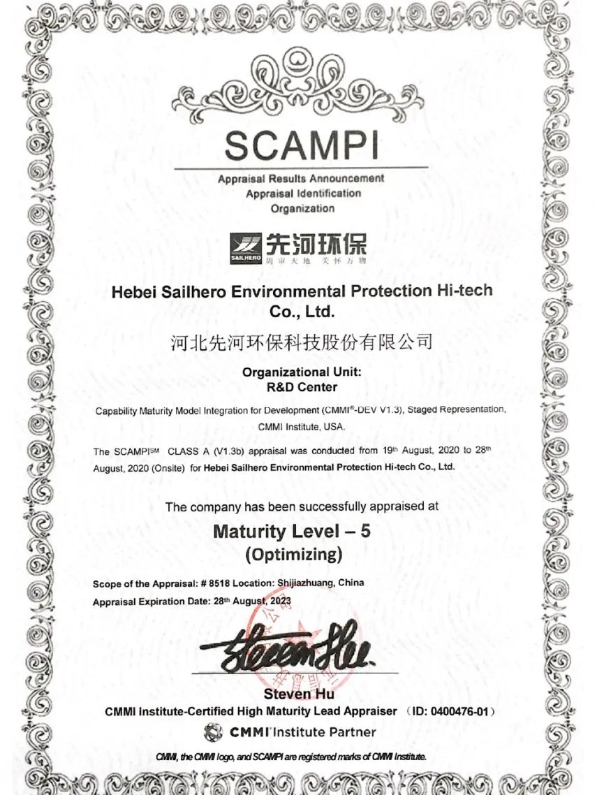 近日,先河環(huán)保通過CMMI5級評估認證并取得證書,此資質(zhì)認證的取得,標志著先河環(huán)保在軟件能力成熟度和項目管理方面達到國際水平,是公司研發(fā)管理體系標準化、規(guī)范化、國際化的重要里程碑,為公司產(chǎn)品的持續(xù)創(chuàng)新和升級奠定了堅實的技術基礎。