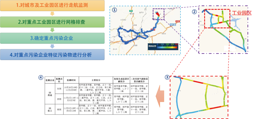 通過對城市環(huán)境空氣VOCs進(jìn)行走航監(jiān)測,發(fā)現(xiàn)高污染工業(yè)園區(qū),對園區(qū)進(jìn)行VOCs走航溯源分析,鎖定高排污企業(yè)后分析特征組分種類與污染水平,為精準(zhǔn)治污提供科學(xué)依據(jù)。
