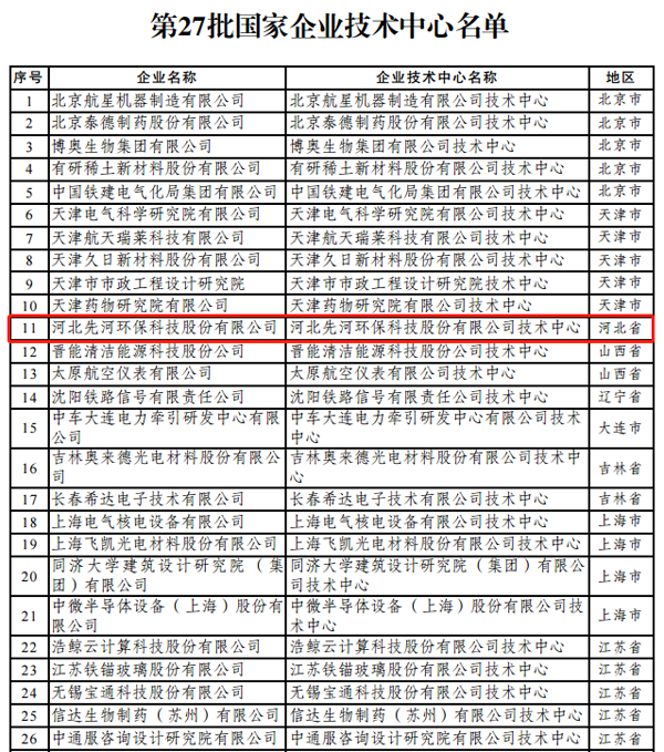 近日,根據《國家企業技術中心認定管理辦法》(國家發展改革委 科技部 財政部 海關總署 稅務總局2016年第34號令),經審定,2020年(第27批)新認定及全部國家企業技術中心名單發布,先河環保被正式認定為國家級企業技術中心,成為2020年(第27批)國家級企業技術中心河北省唯一一家在列名單企業!