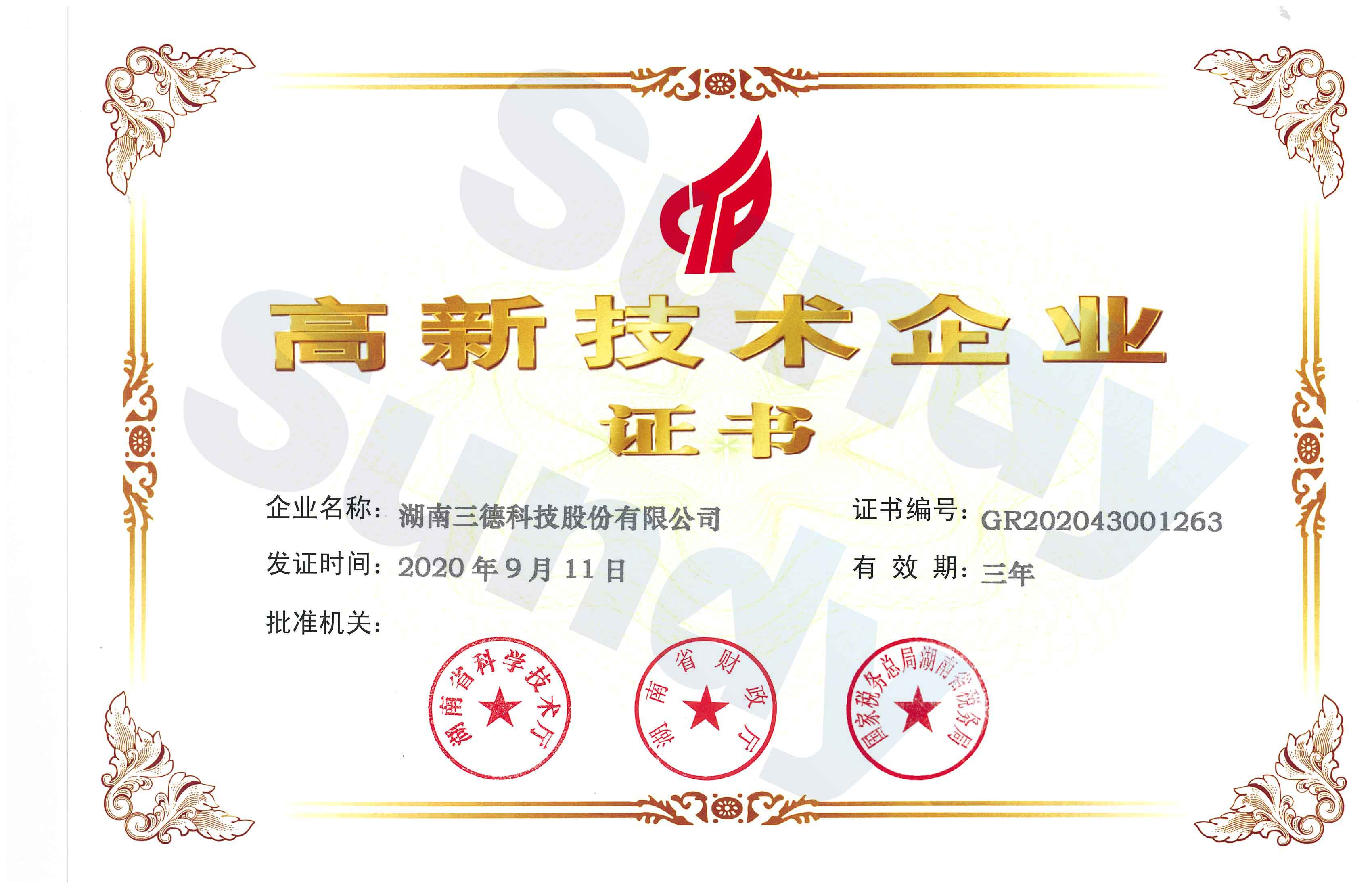 近日,湖南三德科技股份有限公司(下簡稱“三德科技”)及湖南三德盈泰環??萍加邢薰?下簡稱“三德環保”)分別收到湖南省科學技術廳、湖南省財政廳、國家稅務總局湖南省稅務局聯合頒發的《高新技術企業證書》,二者同時獲評為“高新技術企業”。