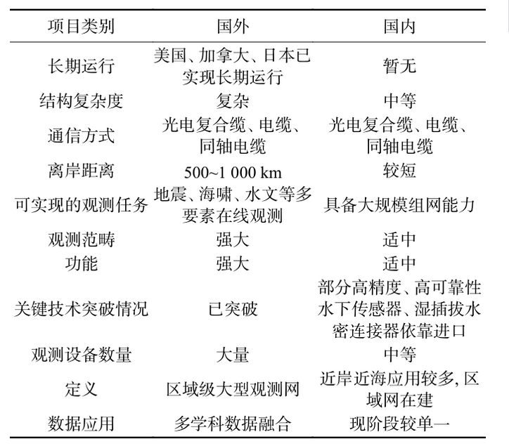 表1 國內外有纜海底觀測技術進展對比
