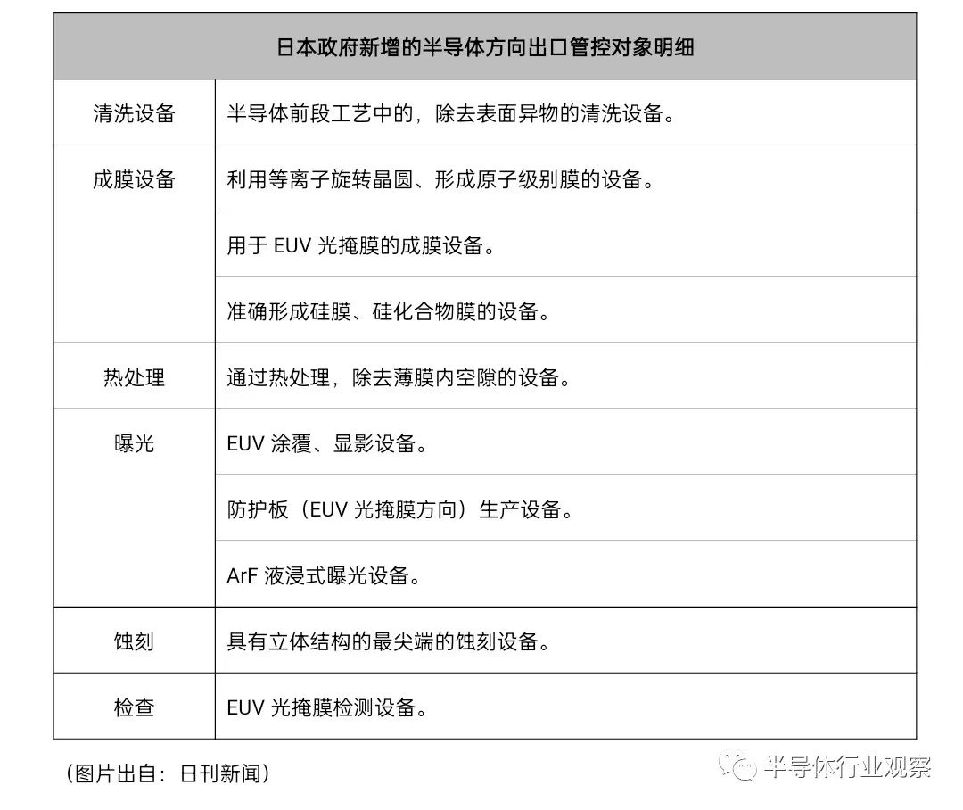 日本經濟產業省發布的清單涉及清洗、成膜、熱處理、曝光、蝕刻、檢查等23個種類,包括極紫外(EUV)相關產品的制造設備和三維堆疊存儲器的蝕刻設備等。