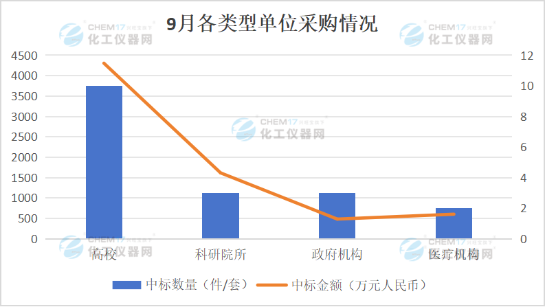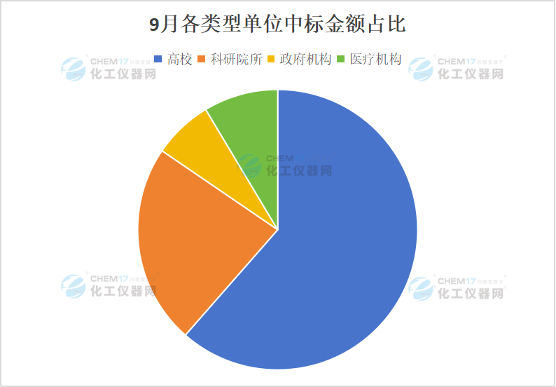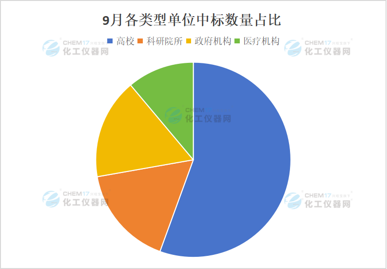據化工儀器網不完全統計,9月高校采購電鏡10套,采購金額為4305.26萬元,約占9月電鏡采購總金額的55.56%。從采購數量上看,科研院所和政府機構的采購數量均為3套,約占9月電鏡采購總數量的16.67%