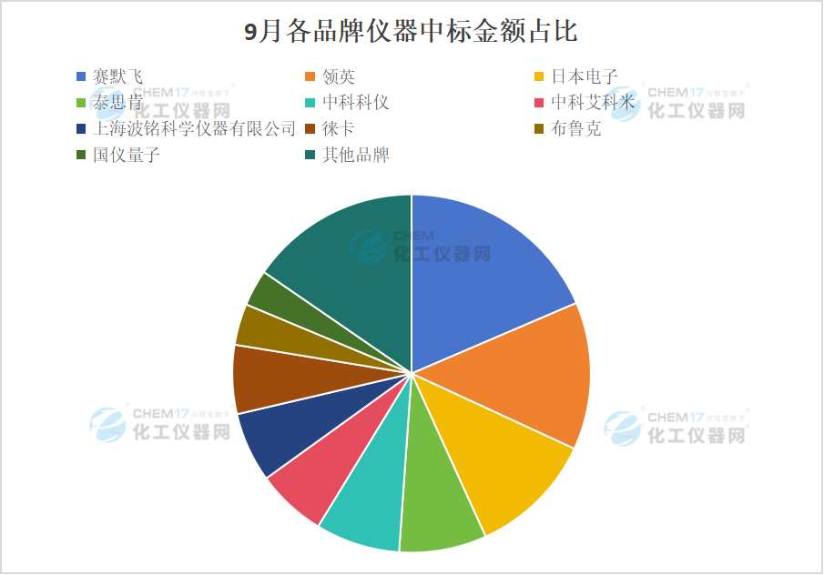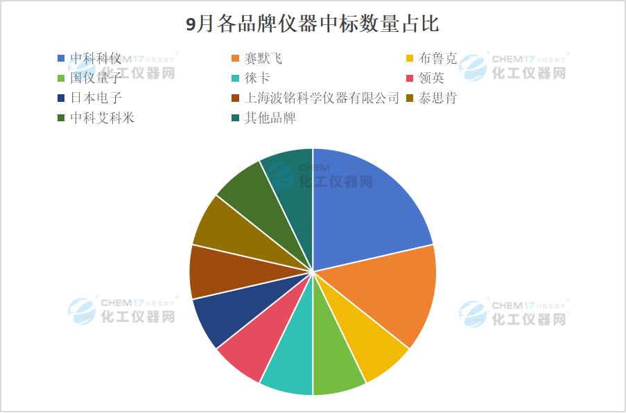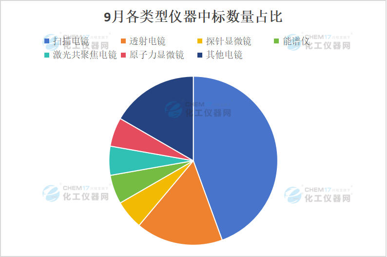 9月各類型儀器中標數量占比”和“9月各類型儀器中標金額占比”可以看出,掃描電鏡占據總中標數量的44.44%,占據總中標金額的36.32%;透射電鏡占據總中標數量的16.67%,占據總中標金額的14.35%