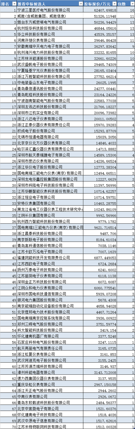 近日,國(guó)網(wǎng)2022年第二次電能表(含用電信息采集)招標(biāo)采購(gòu)?fù)扑]的中標(biāo)候選人公示信息發(fā)布。電能表招標(biāo)采購(gòu)6類284包物資,投標(biāo)報(bào)價(jià)合計(jì)1017238萬元,占2021年度全年金額的50.7%。由71家企業(yè)提供,其中電能表分項(xiàng)中標(biāo)企業(yè)共59家,相比2022年第一次招標(biāo)增加1家;用電信息采集分項(xiàng)中標(biāo)企業(yè)37家,相比2022年第一次招標(biāo)減少1家。本次中標(biāo)金額前三名企業(yè)為寧波三星醫(yī)療電氣股份有限公司、威勝(含威勝集團(tuán)、威勝信息)、煙臺(tái)東方威思頓電氣有限公司。