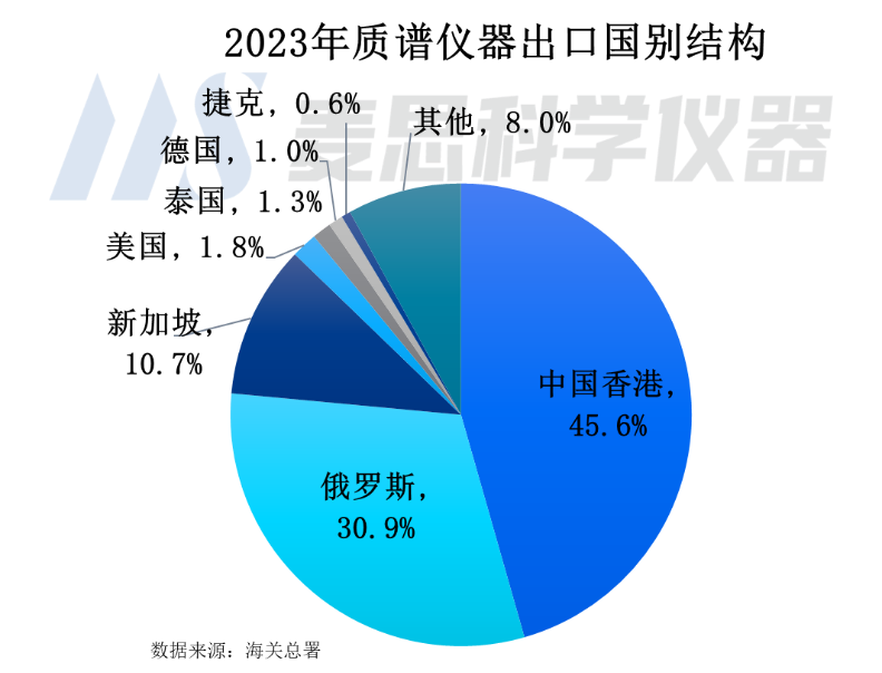 從2023年質譜儀器出口國別結構看,排名前五位為中國香港(轉口貿易)、俄羅斯、新加坡、美國以及泰國,出口金額占比分別為45.6%、30.9%、10.7%、1.8%以及1.3%。