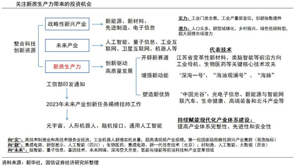 從行業屬性來看,一切利用新技術提升生產力水平的細分領域,都屬于新質生產力的應用范疇,既包括新一代信息技術、新能源、新材料、先進制造、生物技術等戰略性新興產業,也包括人工智能、量子信息、工業互聯網、衛星互聯網、機器人等未來產業。
