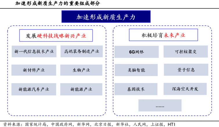 新質生產力的核心在于整合科技創新資源,一方面引領發展戰略性新興產業,國家統計局發布的《戰略性新興產業分類(2018)》中有新一代信息技術產業、高端裝備制造產業、新材料產業、生物產業、新能源汽車產業、新能源產業六大產業和硬科技的概念不謀而合;另一方面積極培育未來產業,在6G網絡、可控核聚變、類腦智能、量子信息、基因技術、深海空天開發等前沿科技和產業變革領域贏得發展主動權,從而以硬科技創新帶動新經濟增長點不斷涌現。