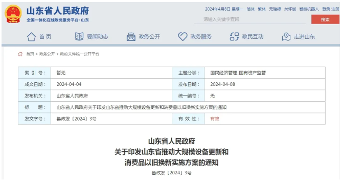 4月8日,《山東省人民政府關于印發(fā)山東省推動大規(guī)模設備更新和消費品以舊換新實施方案的通知》對外發(fā)布。