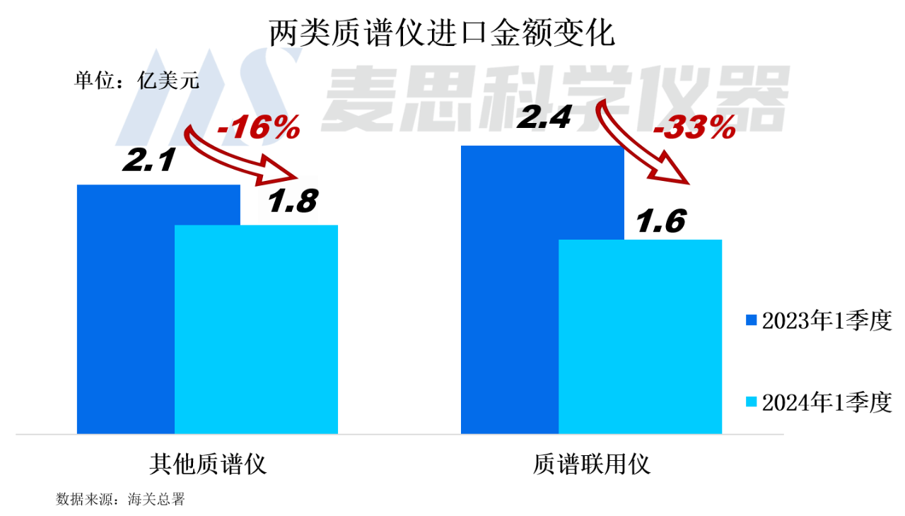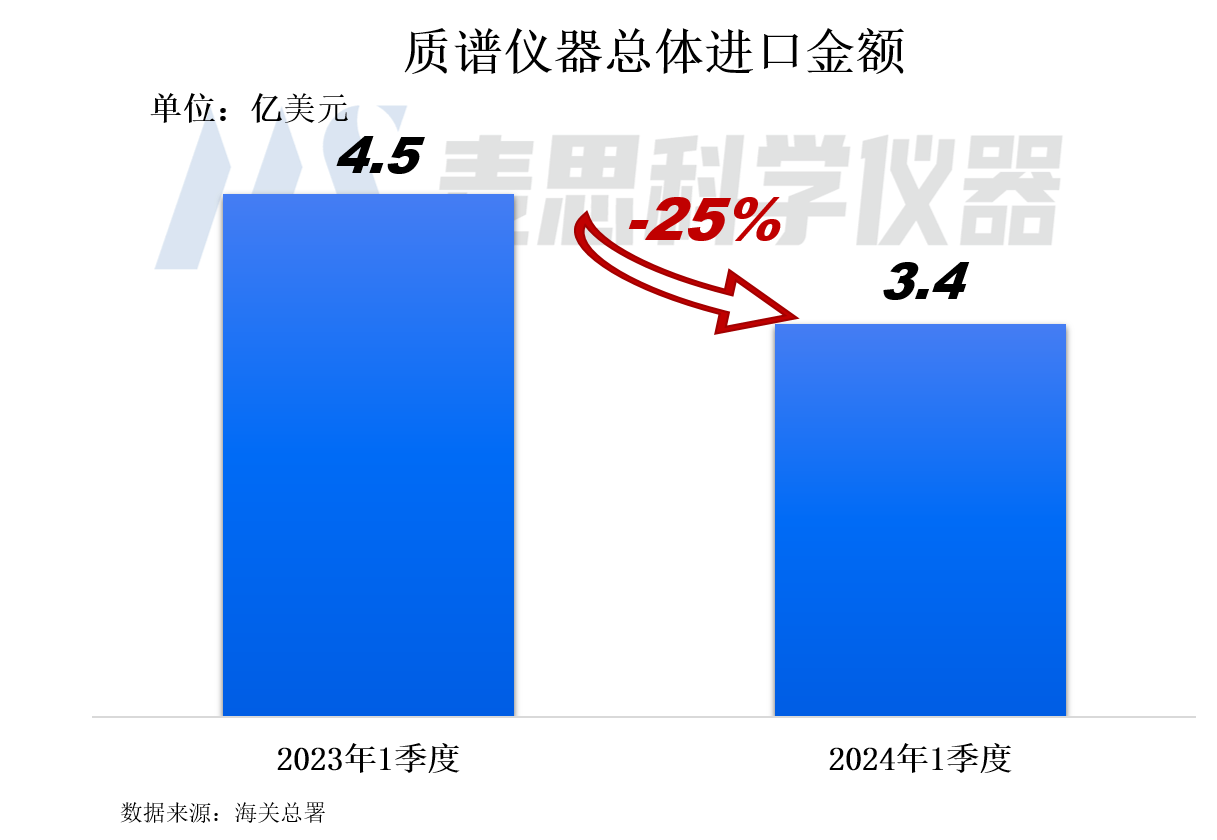 2024年1季度我國質譜儀器(含質譜聯用儀和其他質譜儀)進口金額為3.4億美元(約合人民幣24億元),同比下降25%,這是2021年以來同期進口額首次出現下滑。