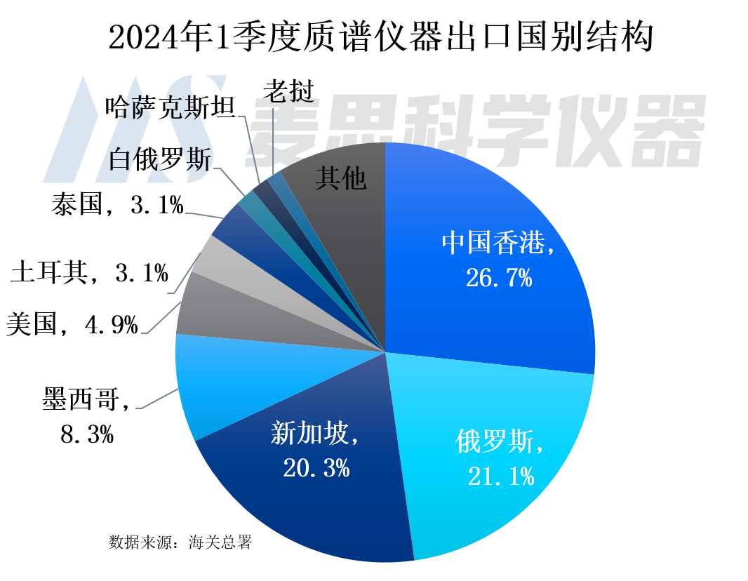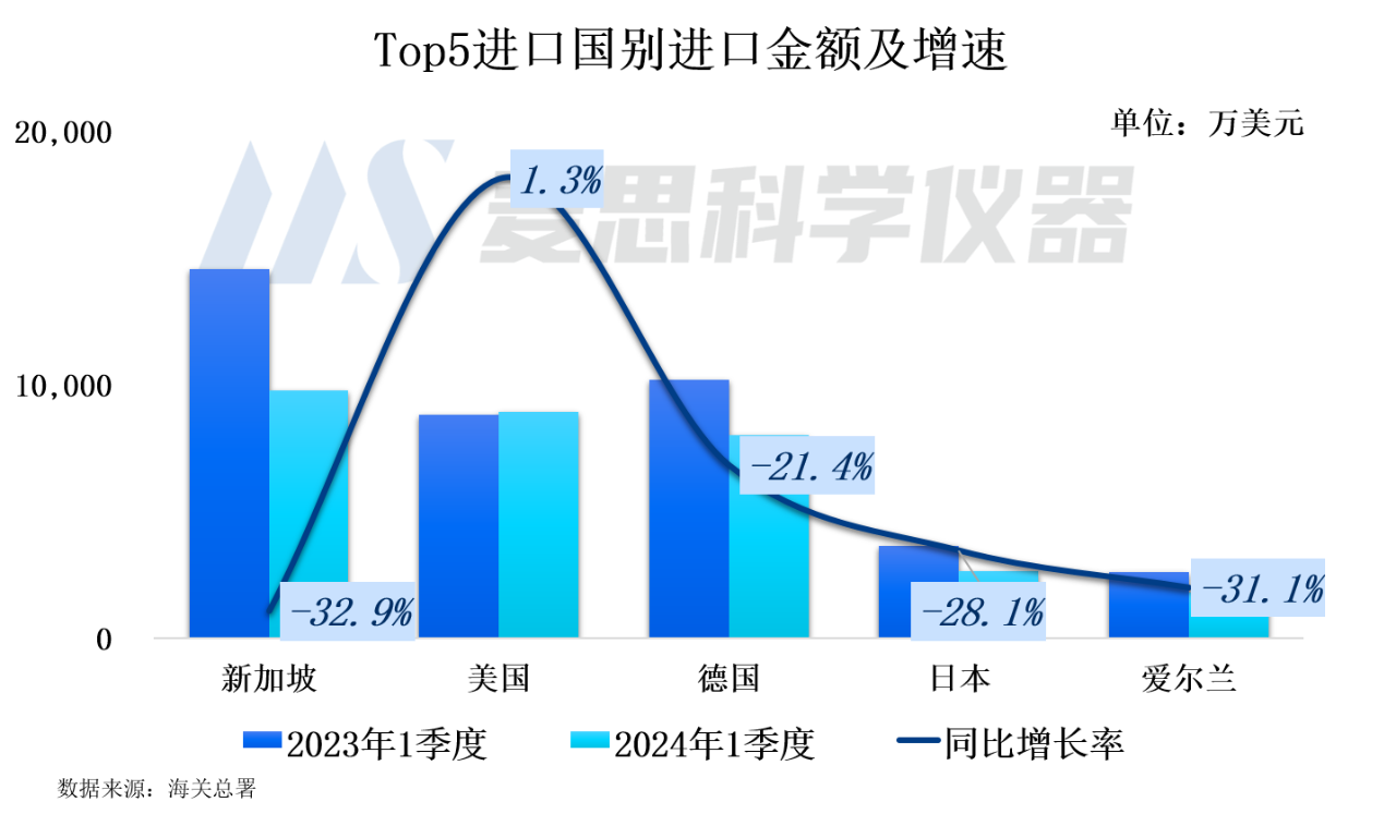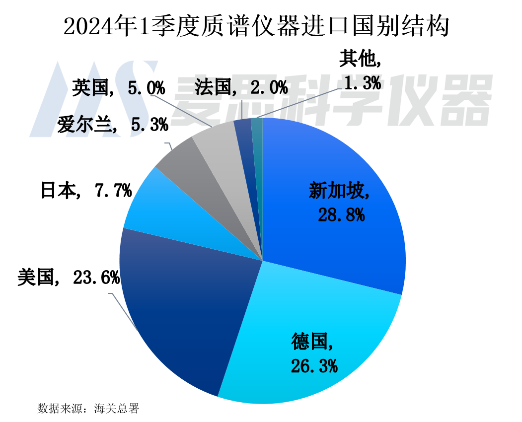 從2024年1季度質譜儀器進口國別結構看,排名前五位為新加坡、德國、美國、日本以及愛爾蘭,進口金額占比分別為28.8%、26.3%、23.6%、7.7%以及5.3%。