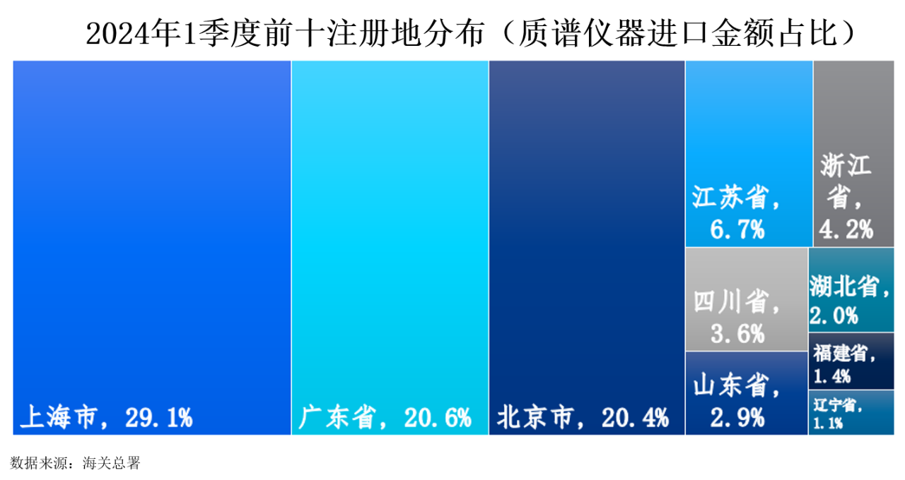 2024年1季度,中國質譜儀器進口額最高的注冊地依次為上海市、廣東省和北京市,分別以29.1%、20.6%和20.4%的占比位居前三。緊隨其后的是江蘇省和浙江省,占比分別為6.7%和4.2%。四川省、山東省、湖北省、福建省以及遼寧省的進口額占比分別為3.6%、2.9%、2.0%、1.4%和1.1%。