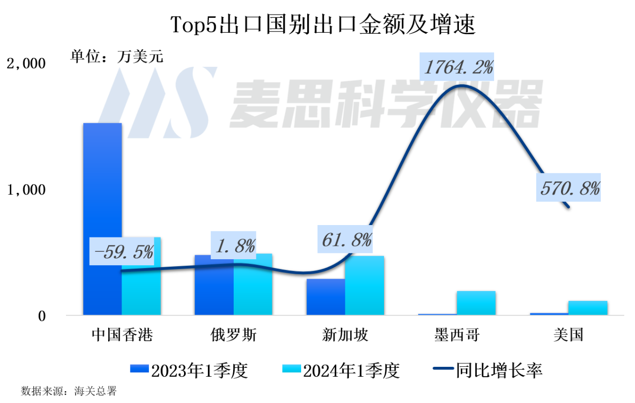 2024年1季度,對香港的出口金額出現了顯著下降,同比降幅高達60%,在出口國別中的占比也較去年同期減少了34個百分點。與此同時,對俄羅斯、新加坡、墨西哥和美國的出口金額卻實現了正增長。特別是對墨西哥和美國的出口,同比增速分別達到1764%和570.8%。