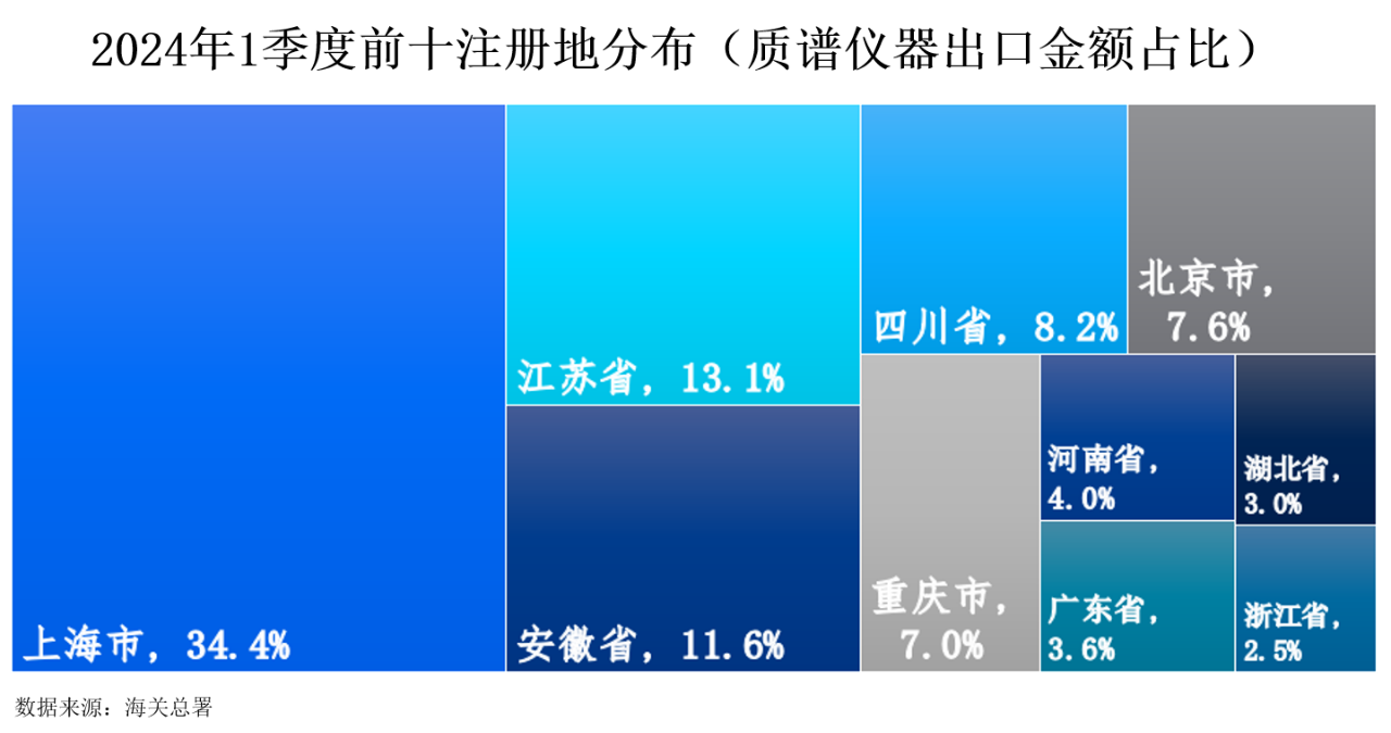 2024年1季度,中國質譜儀器出口額最高的十個注冊地依次是上海市、江蘇省、安徽省、四川省、北京市、重慶市、河南省、湖北省、廣東省和浙江省。其中,上海市以34.4%的占比遙遙領先,江蘇省和安徽省分別以13.1%和11.6%的占比緊隨其后。四川省、北京市和重慶市的占比分別為8.2%、7.6%和7.0%。