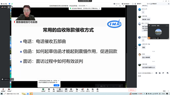 授課直播間氛圍熱烈,學(xué)員與授課老師頻頻互動(dòng)交流,咨詢?cè)跇I(yè)務(wù)開展中實(shí)際糾紛的化解策略。授課老師針對(duì)賬款催收中訴訟手段和非訴訟手段的適用場(chǎng)景進(jìn)行細(xì)致解答。學(xué)員紛紛表示,培訓(xùn)內(nèi)容切中企業(yè)痛點(diǎn),突出應(yīng)收賬款催收技巧實(shí)效性,有助于提高企業(yè)運(yùn)營效率,降低壞賬風(fēng)險(xiǎn)。
