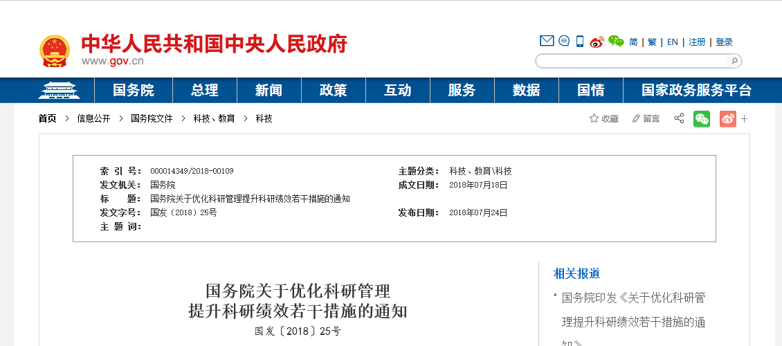 國(guó)務(wù)院關(guān)于優(yōu)化科研管理提升科研績(jī)效若干措施的通知
