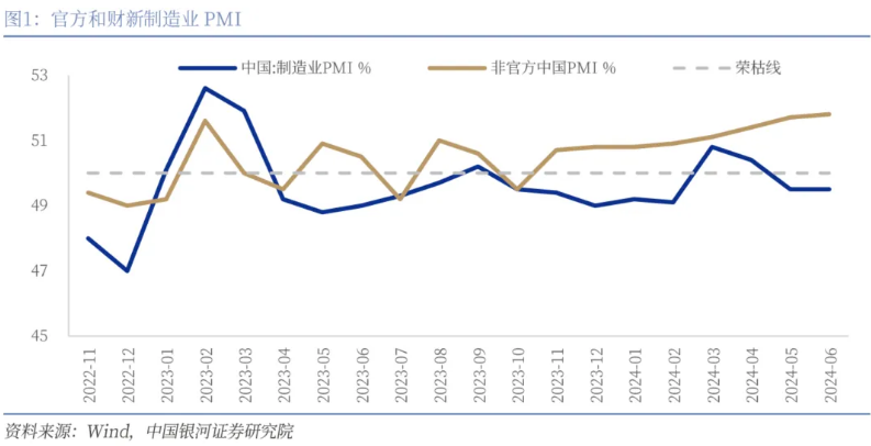 財新PMI再度上行,與中采PMI背離繼續走闊。71日,財新發布6PMI錄得51.8%,環比上漲0.1pct,在擴張區間再次上行。財新PMI202311月以來持續強勢,連續8個月保持擴張。但與此同時官方制造業PMI和財新PMI卻持續背離,這8個月期間官方制造業PMI平均為49.61%,而財新PMI均值為51.15%,且背離幅度有走闊趨勢。