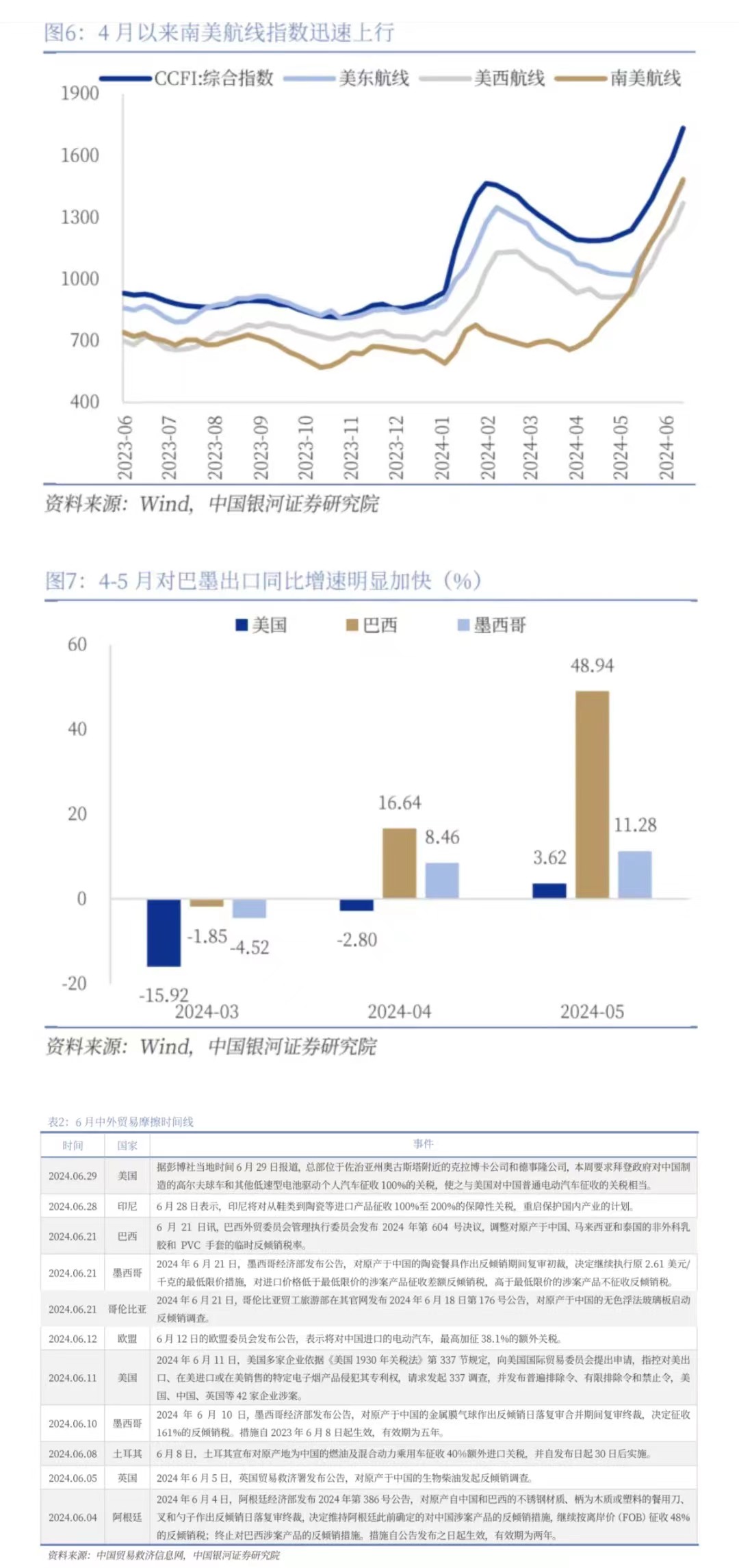 受制于進口國貿易政策的變化和地緣政治的潛在影響,企業出現搶出口行為。514日美方發布對華加征301關稅四年期復審結果,進一步提高對自華進口的電動汽車等約180億美元商品加征關稅,6月以來歐盟、土耳其、巴西、印尼等也陸續宣布將對我國部分出口商品加征關稅。受此因素驅動,企業出現搶出口行為以規避高額關稅。5月份以來,CCFI指數迅速上漲,美西、美東、南美航線運價上漲尤其顯著。對外貿更加敏感的中小企業具有更顯著的搶出口效應,5月出口增速改善幅度顯著好于出口交貨值增速。