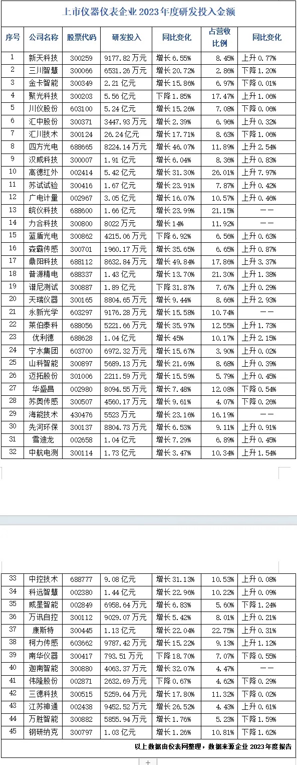 在此背景下,國內(nèi)儀器儀表企業(yè)對研究與開發(fā)方面的投入愈發(fā)重視,不斷引入創(chuàng)新,提高自身技術(shù)先進性以生產(chǎn)出具有競爭力的高質(zhì)量產(chǎn)品,從而在這場發(fā)展機遇中占據(jù)有利地位。為方便業(yè)內(nèi)人士深入了解我國儀器儀表企業(yè)研發(fā)投入現(xiàn)狀,儀表網(wǎng)整理了國內(nèi)45家上市儀器儀表企業(yè)2023年度研發(fā)金額、研發(fā)投入占比等數(shù)據(jù),以饗讀者。