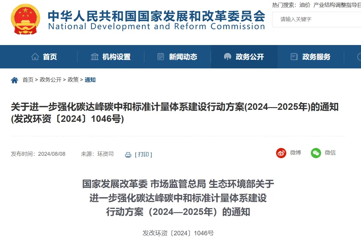 國家發(fā)展改革委 市場監(jiān)管總局 生態(tài)環(huán)境部關于進一步強化碳達峰碳中和標準計量體系建設行動方案(2024—2025年)的通知