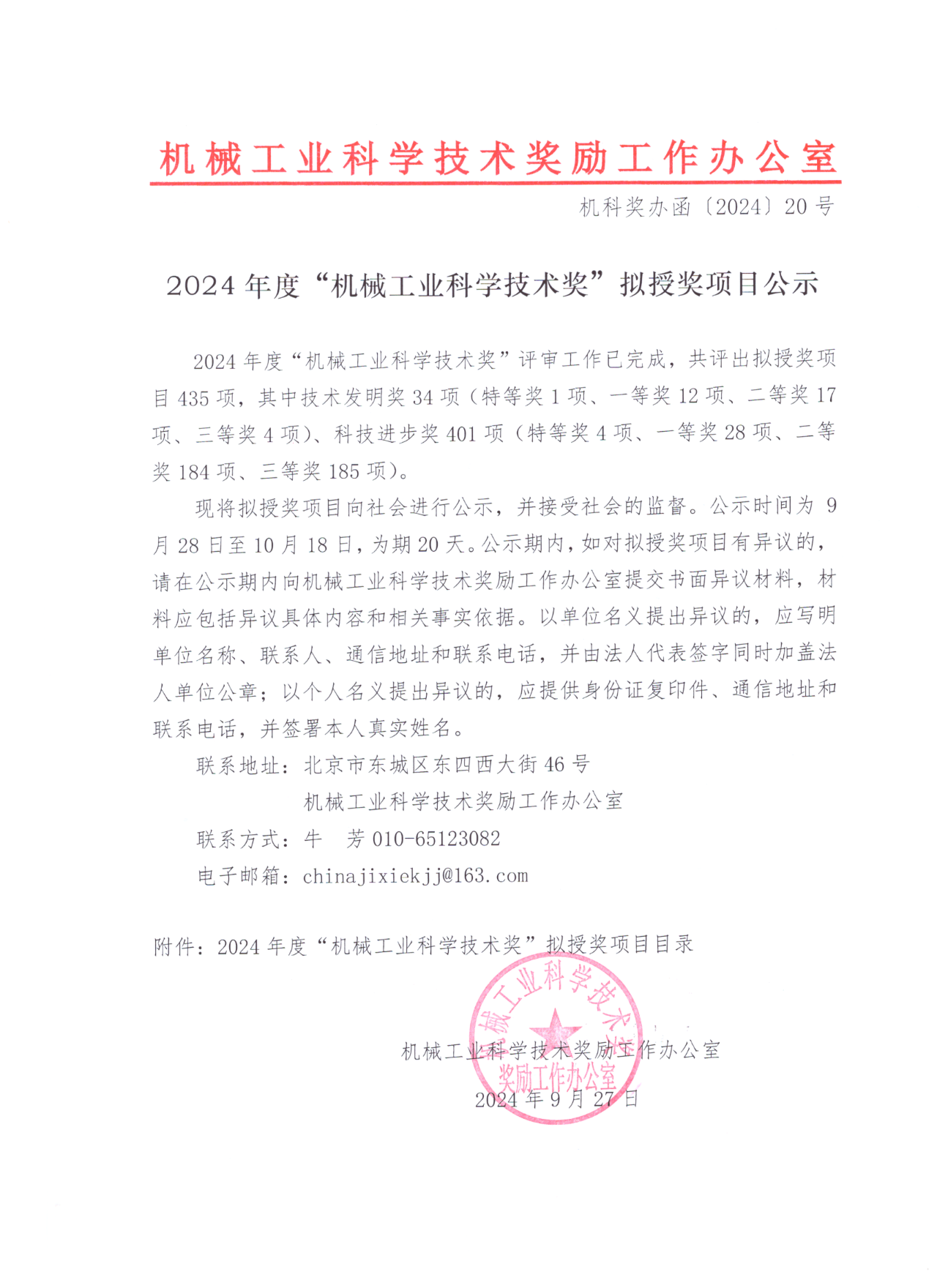 中國機(jī)械工業(yè)聯(lián)合會(huì)已將擬授獎(jiǎng)項(xiàng)目向社會(huì)進(jìn)行公示,并接受社會(huì)的監(jiān)督。公示時(shí)間為9月28日至10月18日,為期20天。公示期內(nèi),如對(duì)擬授獎(jiǎng)項(xiàng)目有異議的,請(qǐng)?jiān)诠酒趦?nèi)向機(jī)械工業(yè)科學(xué)技術(shù)獎(jiǎng)勵(lì)工作辦公室提交書面異議材料,材料應(yīng)包括異議具體內(nèi)容和相關(guān)事實(shí)依據(jù)。以單位名義提出異議的,應(yīng)寫明單位名稱、聯(lián)系人、通信地址和聯(lián)系電話,并由法人代表簽字同時(shí)加蓋法人單位公章;以個(gè)人名義提出異議的,應(yīng)提供身份證復(fù)印件、通信地址和聯(lián)系電話,并簽署本人真實(shí)姓名。