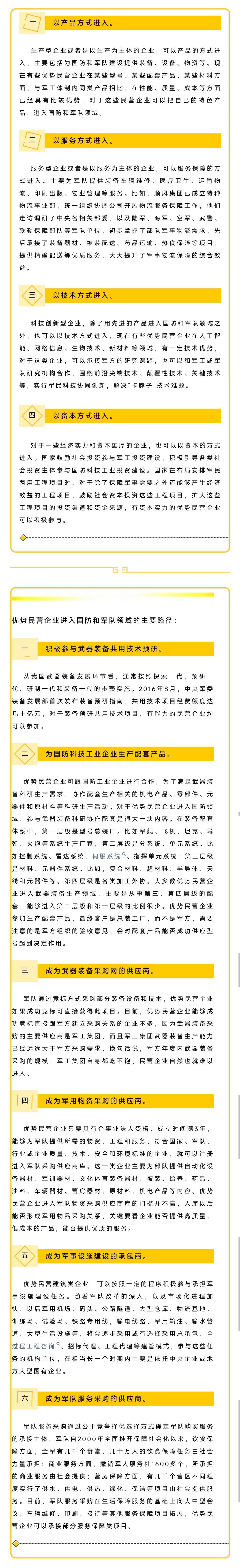 優勢民營企業以什么樣的方式進入國防和軍隊建設領域,應當根據企業自身的實際具體情況具體分析,注重發揮自己的優勢和特長,選擇相應的方式進入,具體講,可以從產品、服務、技術和資本等方式進入。