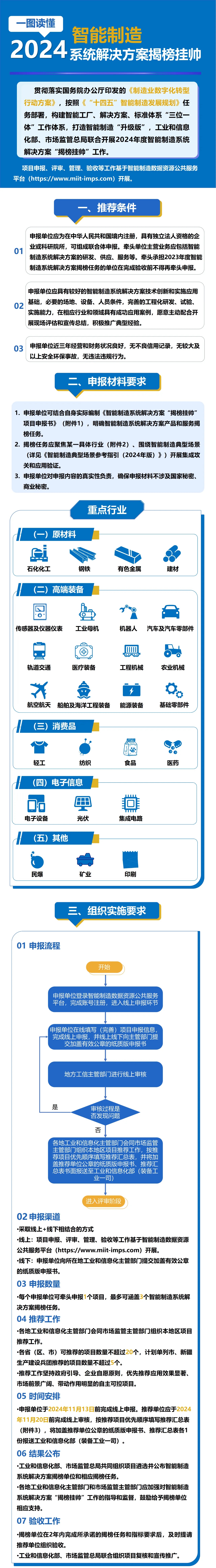 貫徹落實國務(wù)院辦公廳印發(fā)的《制造業(yè)數(shù)字化轉(zhuǎn)型行動方案》,按照《十四五智能制造發(fā)展規(guī)劃》任務(wù)部署,構(gòu)建智能工廠、解決方案、標準體系三位一體工作體系,打造智能制造升級版,工業(yè)和信息化部、市場監(jiān)管總局聯(lián)合開展2024年度智能制造系統(tǒng)解決方案揭榜掛帥工作?,F(xiàn)將有關(guān)事項通知如下: