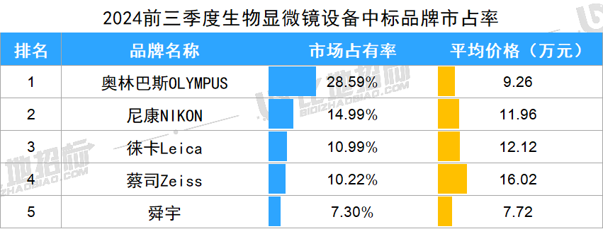 據(jù)比地招標(biāo)網(wǎng)統(tǒng)計(jì):2024年前三季度,生物顯微鏡招投標(biāo)市場(chǎng)有871家采購單位,872家中標(biāo)單位,中標(biāo)設(shè)備數(shù)量達(dá)2834臺(tái),中標(biāo)總金額約3.90億元。(產(chǎn)品關(guān)鍵詞:生物顯微鏡、倒置生物顯微鏡、熒光生物顯微鏡等)