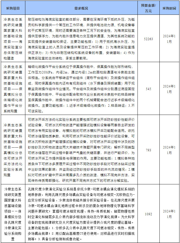 近日,中國科學(xué)院南海海洋研究所發(fā)布8項儀器設(shè)備采購意向,預(yù)算總額達5.61億元,涉及海底實驗室分總體耐壓結(jié)構(gòu)建造、保真模擬分總體精細(xì)化微操作平臺分系統(tǒng)、保真模擬分總體可燃冰開采方法優(yōu)化實驗分系統(tǒng)、保真模擬分總體孔隙尺度冷泉演化實驗分系統(tǒng)等,預(yù)計采購時間為2024年11~12月。