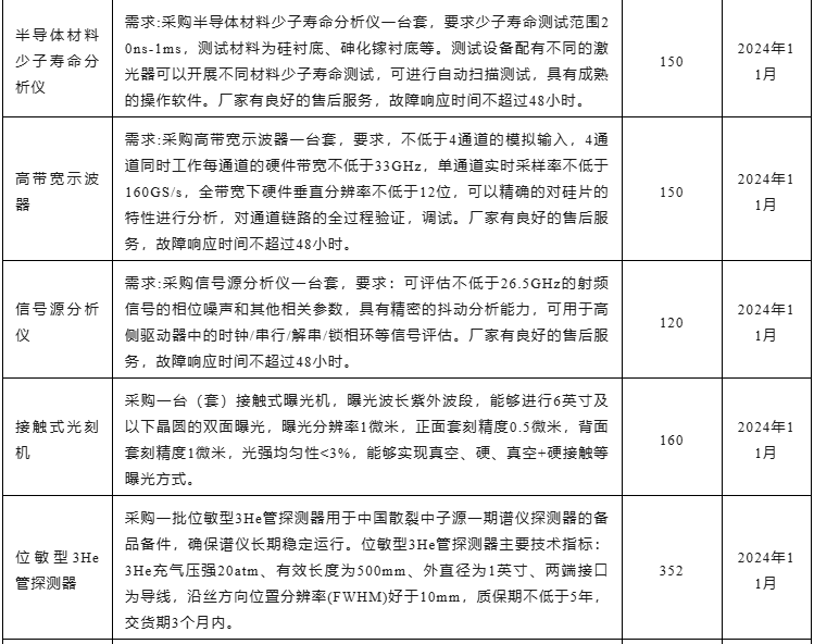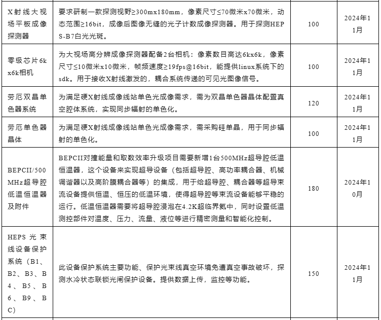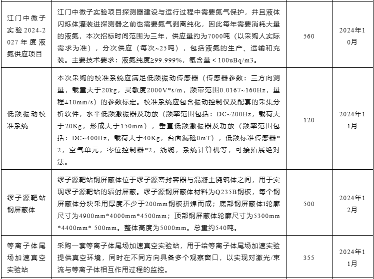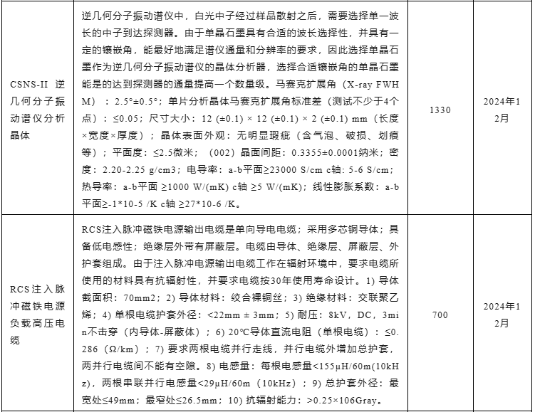 近日,中國科學(xué)院高能物理研究所發(fā)布25項(xiàng)儀器設(shè)備采購意向,預(yù)算總額達(dá)0.98億元,涉及CSNS-II逆幾何分子振動譜儀分析晶體、高速細(xì)線楔形鍵合機(jī)、背散射譜儀束線前端鋼屏蔽體、X射線大視場平板成像探測器等,預(yù)計(jì)采購時(shí)間為2024年10月~2025年1月。