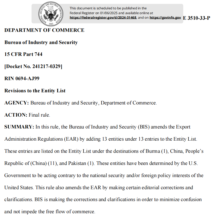 這一決定將于1月6日正式生效,標(biāo)志著美國(guó)對(duì)包括中國(guó)在內(nèi)的國(guó)家特定實(shí)體的出口管制措施進(jìn)一步收緊。