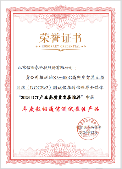 當前,ICT行業正經歷著前所未有的變革與發展。隨著5G技術的廣泛應用、云計算的蓬勃興起以及人工智能與物聯網的深度融合,行業競爭愈發激烈,ICT企業逐鹿行業前沿,或攻堅技術,或打磨產品,或拓展應用,全力探索高質量發展之路。1218日,2025 ICT行業趨勢年會在北京舉辦。會議期間,通信世界“2024 ICT產業高質量發展推薦正式發布。“X5-400G高密度智算無損網絡(ROCEv2)測試儀入選“2024 ICT產業高質量發展推薦