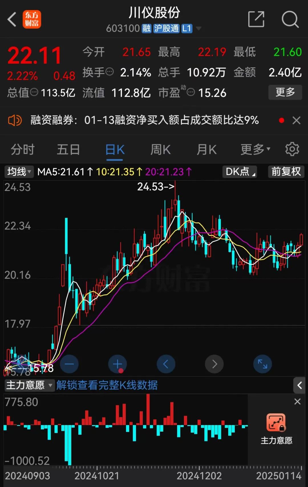 1月14日收盤,川儀股份股價報(bào)22.11元/股,漲幅為2.22%,總市值為113.5億元。